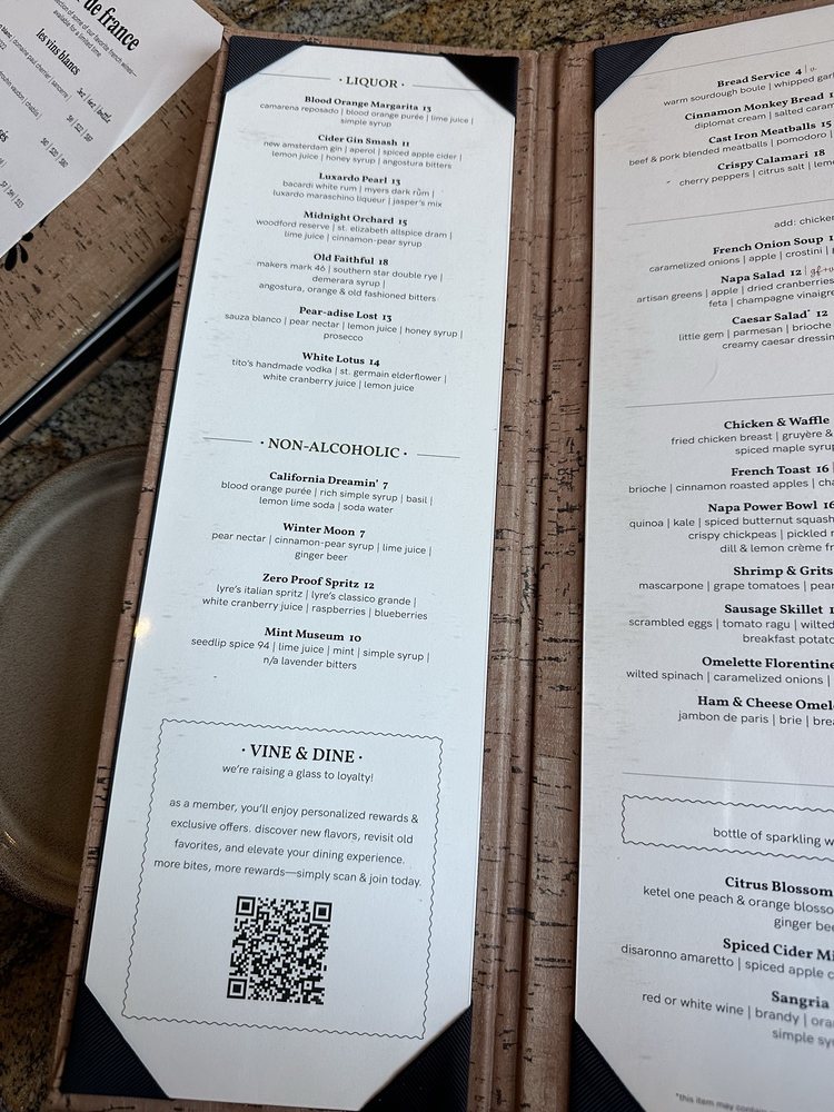 “ Napa on Providence is top tier from the moment you enter. Friendly hostess and servers, beautiful decor, and plenty of seating. My group dined in on a Sunday, it didn't seem overly busy. My one complaint, just to get it out of the way so we're can get to the good stuff: the wait time for meals was quite long. We'd had a couple of starters and bread service, then he took our meal orders. It took about 35 minutes from the arrival of our bread to the arrival of our meals. I felt that was a bit long. The server was apologetic, and the food being good was a good thing. I got the French toast, adding a side of breakfast potatoes and bacon. I loved that the bread wasn't soggy! The sweetness was perfectly balanced and the chantilly cream was airy and beautifully done. I also liked the bacon, it was perfectly crispy and meaty, and the potatoes were well seasoned. I also got the Mint Museum mocktail and it was very good, refreshing, high not as minty I expected it to be. My husband got the steak and eggs, as did one of our guests. They both talked about how well the steak was cooked and seasoned. I'm try that next time. Or, will I try the chicken and waffles?! I don't handed a picture of it, but I was able to taste the gruyere chive waffle and yum! I will definitely return for lunch and dinner. ”